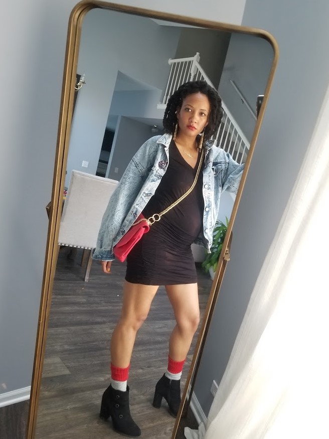 So how to wear a mini- dress with a baby on board? Decide you want to wear a mini dress (that’s half the battle – if not more). No need to shop dresses labeled “maternity”. Find a mini-dress with ruched sides that have plenty of elastic to not suffocate the expanding bump! Making sure there is give in the belly area so you have wiggle room & feel comfortable. If you’re pregnant and it’s cold as a motha sucka, don’t fret! Simply pair the mini dress with leggings, boots of your choice, and for extra flare a -poppin blazer or jacket!