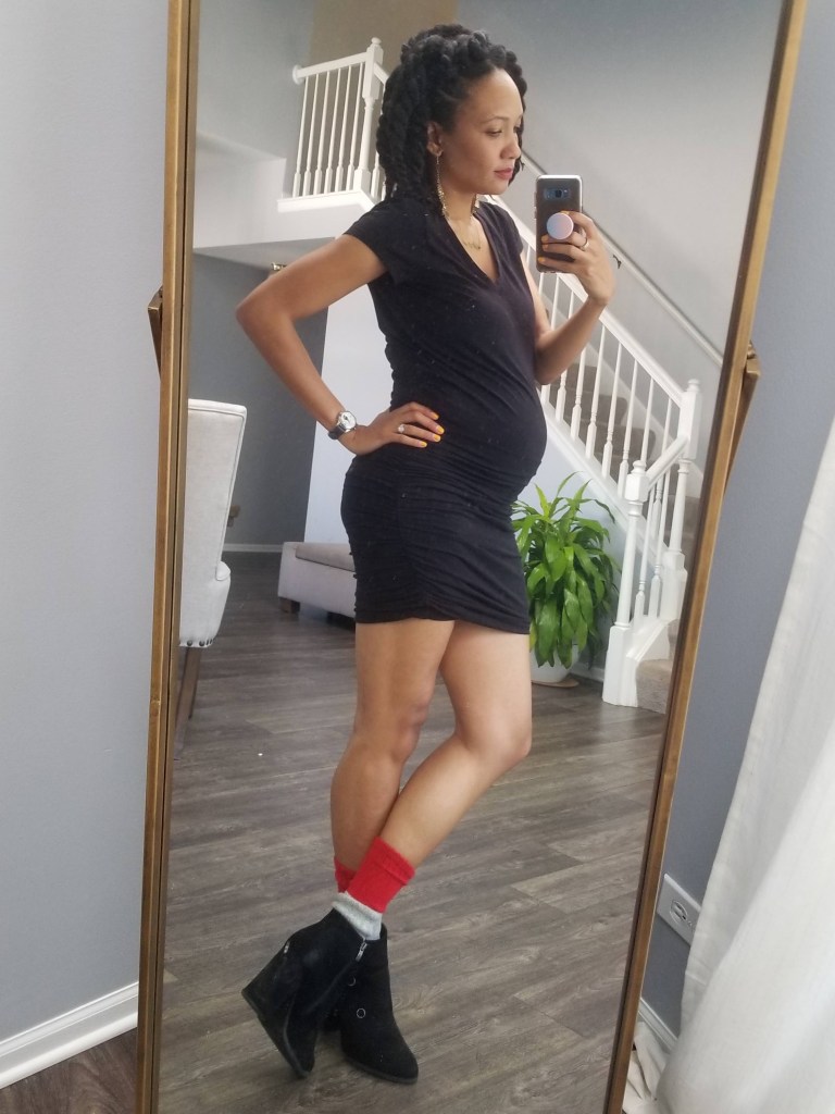 Girl, Yes! You most certainly can rock a mini dress while pregnant! One of my favorite lounge dresses is a thrifted Athleta Black V-Necked Topanga Dress. I wore it all the time before getting knocked up – so I figured why give up now!!! Allow those extra curves and thick thighs to elevate the sexy mamacita-ness! My strategy is: