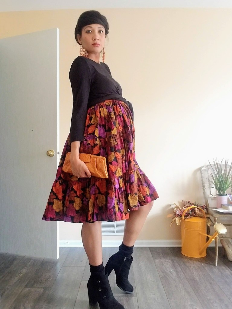 I was laying on my office couch staring out the window when I saw leaves beautifully falling from the trees in great numbers. This triggered me to rummage through my reseller bin for a full length skirt I previously thrifted. It has a richly colored leaf pattern that matches the fall season perfectly.