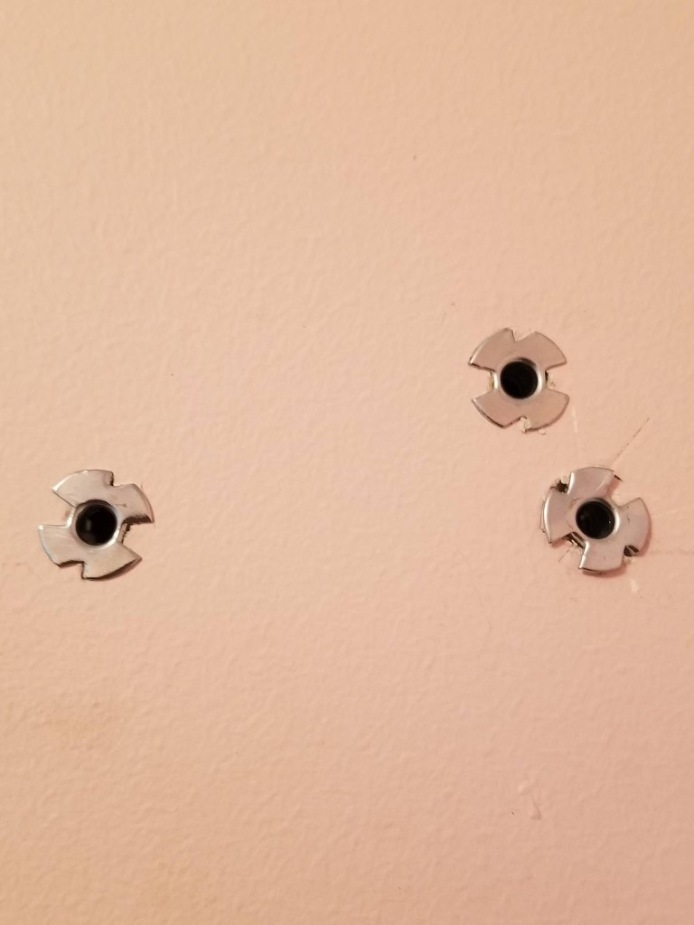 You see – once the anchor was inserted into the wall there were 5 prongs that popped out on the backend (unknown to me, but now I know) to keep it in place. These motha suckaz took the strength of 1 million bunny foo foo’s to remove. Removing these anchor screws resulted in:
