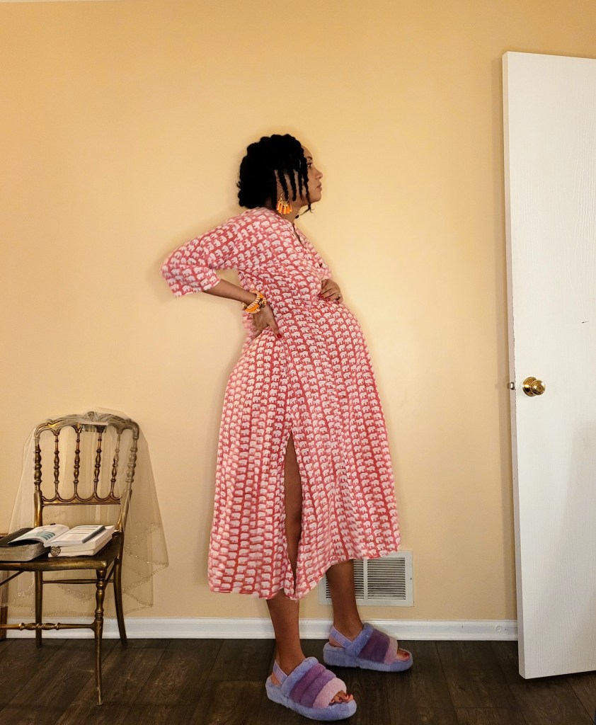 - Getting dressed up in a pink elephant patterned gown (perfect for a large bump!)