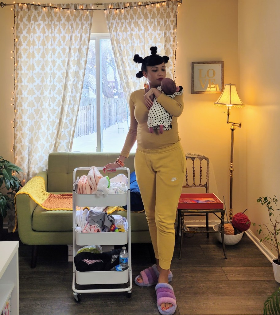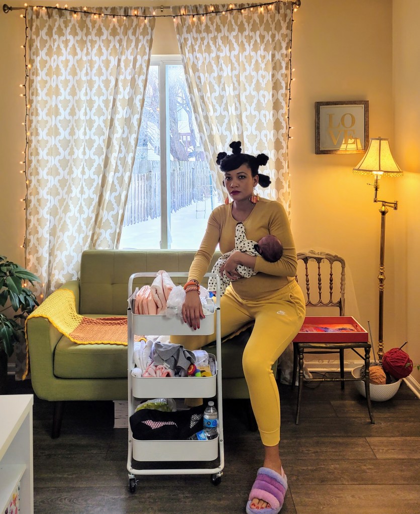 I don’t have to specify what item to grab. I just get the whole cart and grab what I need at the time. I do my part to put back what I used so the Cozi Cart stays ready to go! It’s also nice to hold the baby in one hand and wheel the cart in the other. The sound of the wheels makes me feel uneffable! I equate it to the sound of hearing your heels hit the pavement! Ya know, those instant vibes of:
