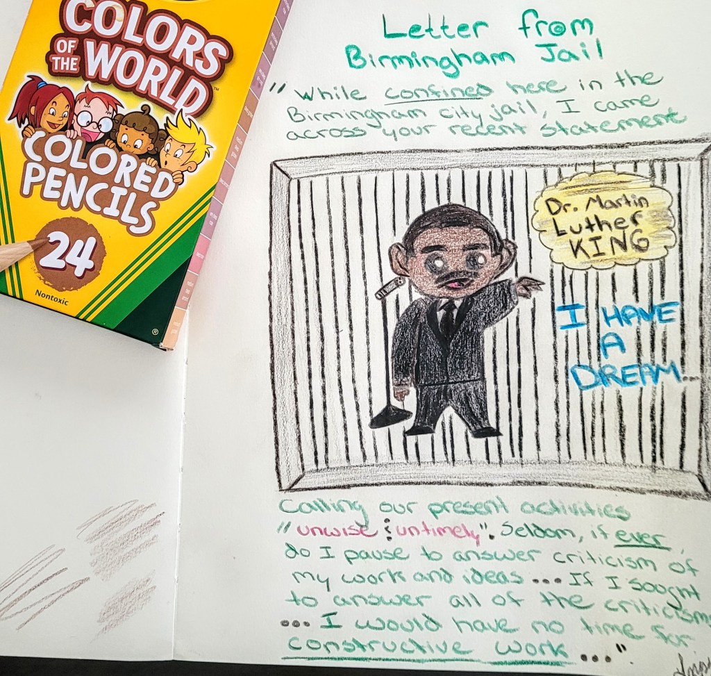 As an adult, I am thankful to have an employer that honors MLK Day. On my day off, I sketched to reflect on his service to humanity and listened to a recording of his “Letter From Birmingham Jail”.