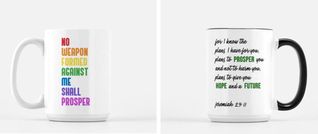 Sipping coffee and meditating on God’s word makes for a great combo. These two mugs from Cherrelle’s Etsy shop are rotating on my home office desk.