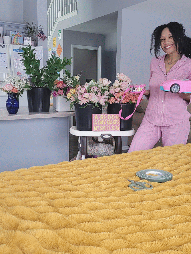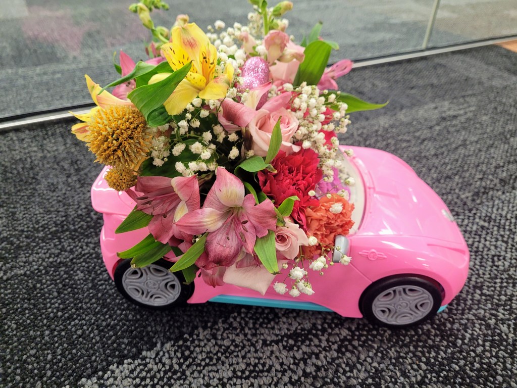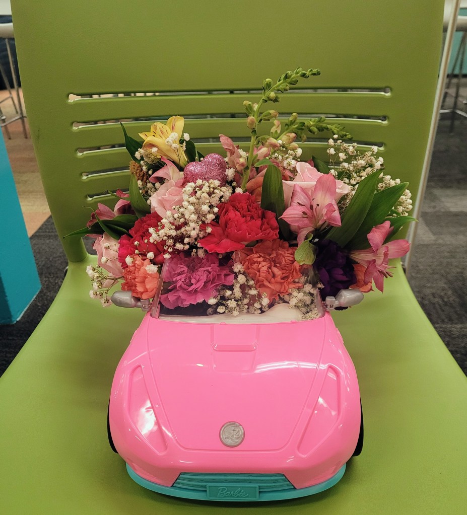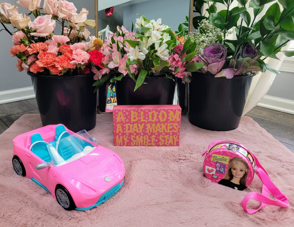 This Barbie Blossom Bash idea really took off! I decided to step into this floral frenzy early Friday morning, quickly shot an inFUNmercial, did the work of designing, and then hit the road to find someone to bless.