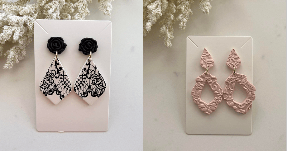 “This is a hard one! It’s a tie between my black and white lace dangle with black rose stud and the light pink textured floral Calista shape dangles. Both are stunning for a night out! It was hard letting someone buy them!”