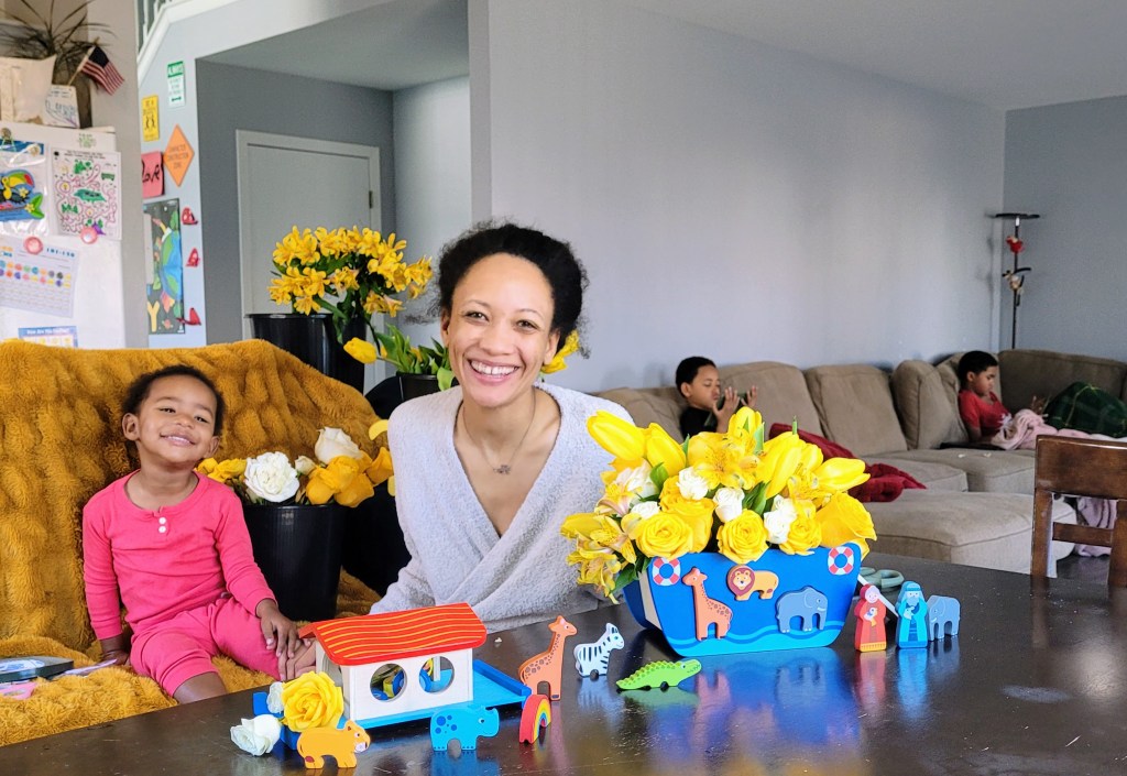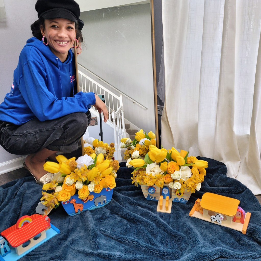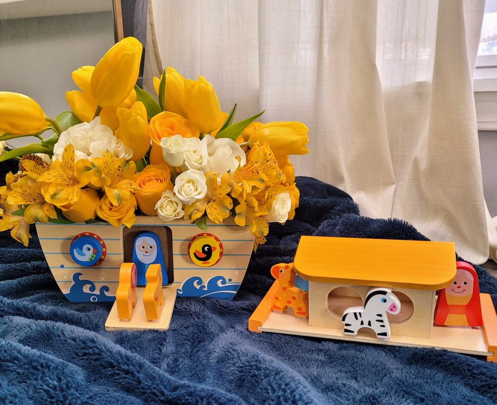 I recently took on the challenge of creating two mid-sized Noah’s Ark themed arrangements for a baby shower! Noah’s Ark Shape Sorter Toys were used as the floral vessels. I enjoy using toys to hold blooms as it serves a playful purpose once the blooms wilt.