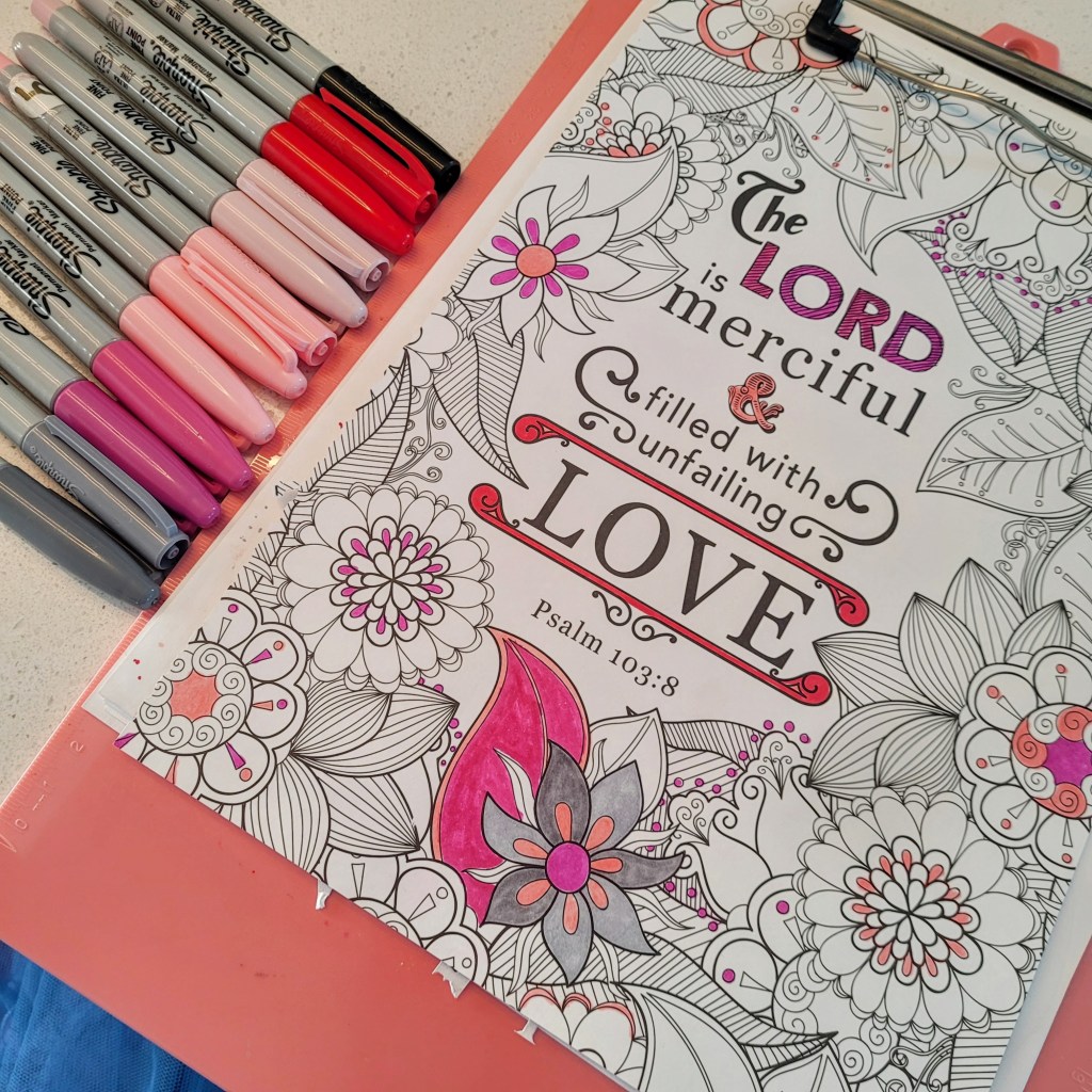 A while back, I was gifted this “The Psalms In Color – Coloring Book” (affiliate link) with beautiful artwork and scriptures. I’ve been working on my love themed “Jesus Loves You” bathroom, so I selected pages that had hearts on them or scriptures with the word “love”. My ultimate plan being to put the completed pages on the bathroom walls.