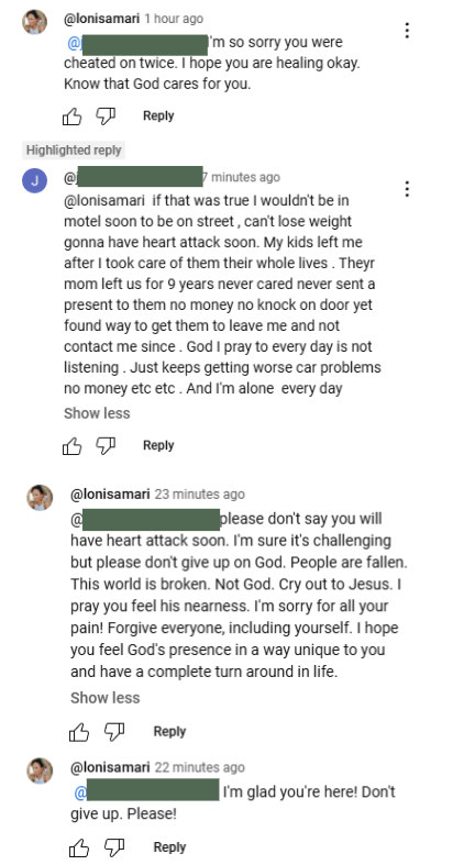 I’m so sorry for all the pain you’ve experienced in life!!! The people here (you and I included) are flawed and this world is broken. Go look at the stories of suffering on the internet. This is a conversation I had tonight with an unknown man, underneath a Janet Jackson love ballad video on YouTube: