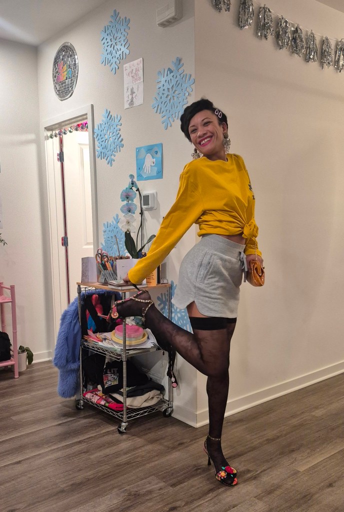 To cover up toesies that are in much need of a manicure and to give my legs some coverage – I wore high thigh stockings! They make me feel like a secret agent that is ready for combat!