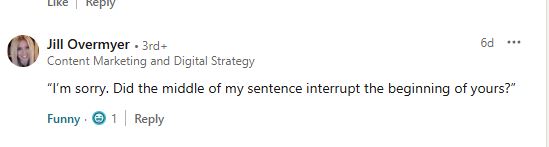 One of the comments said something like ” Oh, I’m sorry that the middle of my sentence interrupted the beginning of your sentence.”….I felt that.
