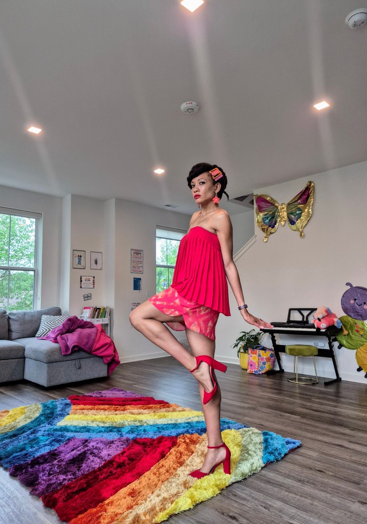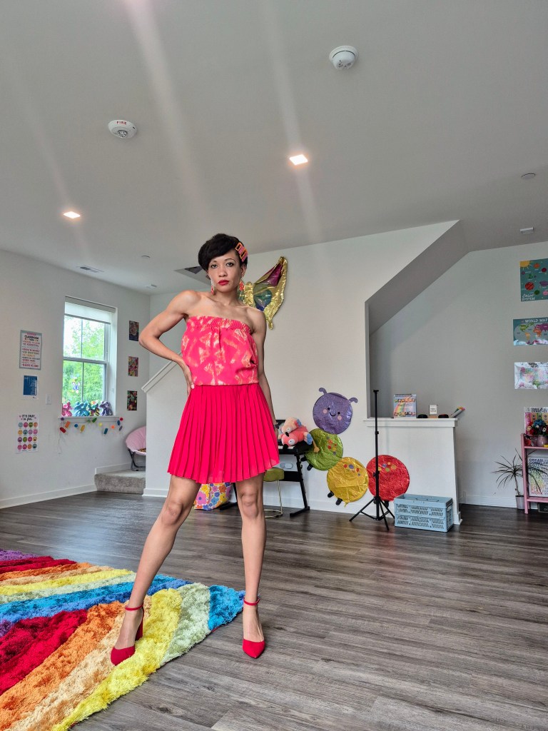 For the first look – I pull up red pleated skirt into a halter top and then wore a pink skirt! It looked like a flowy dress at the top and more fitted in the waist.