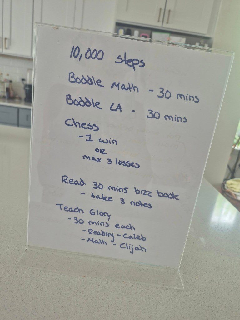 They are required to get 10k steps before any type of “free play” tech. They both have to hit the goal for tech to be unlocked. This teaches that individual success although great is not better than making sure those on the team are accelerating too.