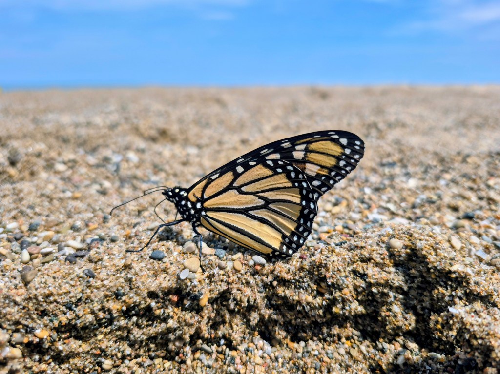 They were flying around everywhere in clusters! Mixed in with the yellow butterflies was a beautiful Monarch. I was able to get up close to it!