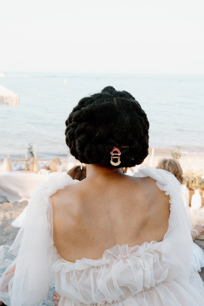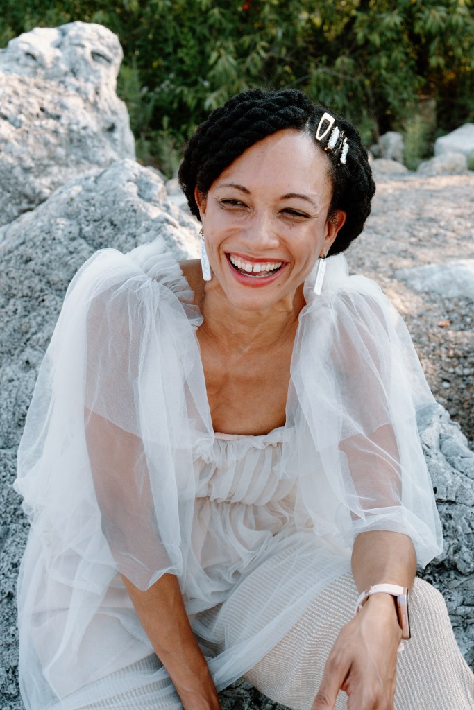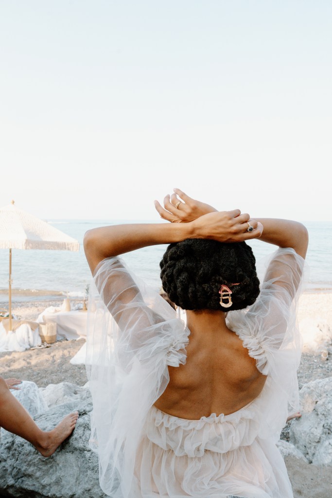 The photo/video shoot was set along a beautiful shoreline with rocks and sand. The organizer took the time to arrive beforehand to set up a long low rise intimate gathering table setting, the kind where you are sitting on the ground directly on blankets (no chairs). Oh, it was giving south of France fancy! Straight up Pinterest goals! The props were proppin’! There was a large tan umbrella, coolers, sparkling water, and greenery to set the scene.