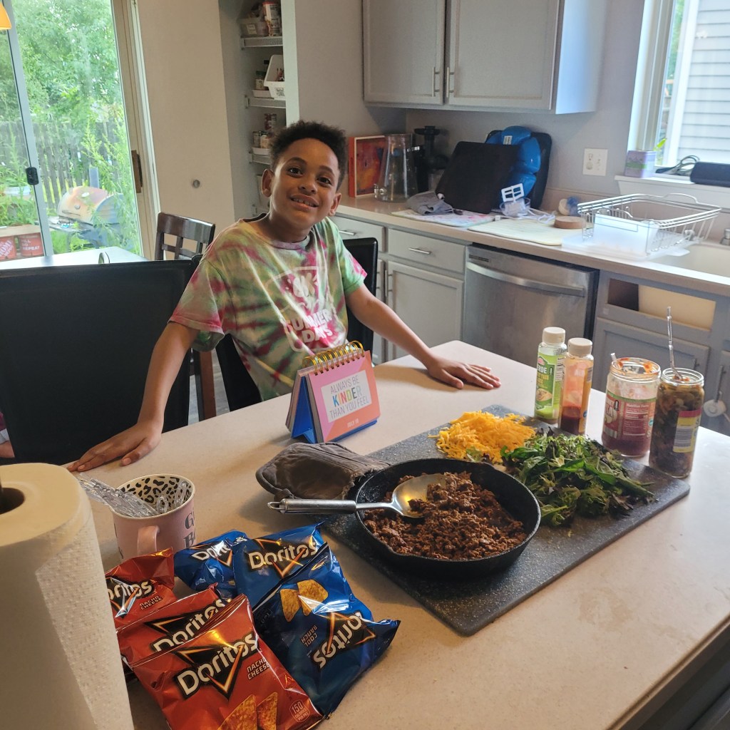 A great starter meal is tacos. The core skills are browning meat and chopping. Tacos are a solid, “get on the green” meal as you can start very basic -> meat, cheese, lettuce, salsa, and some tortilla chips/tortilla.