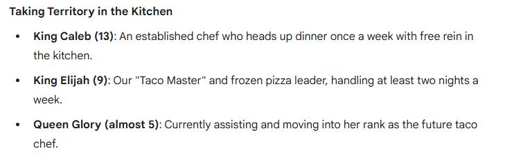 Each child (age appropriate, properly skilled) can take one meal per week. My goal is for each of my children to have 14 meals mastered before they leave from under my roof. They are to be empowered with life skill training.