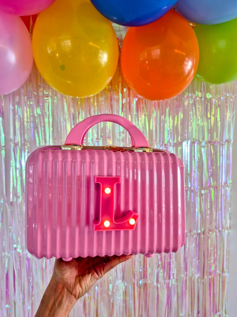 If you want to make your own – all you need is this pink hardshell cosmetic bag from Walmart, velcro strips, and a mini letter light of your choice!