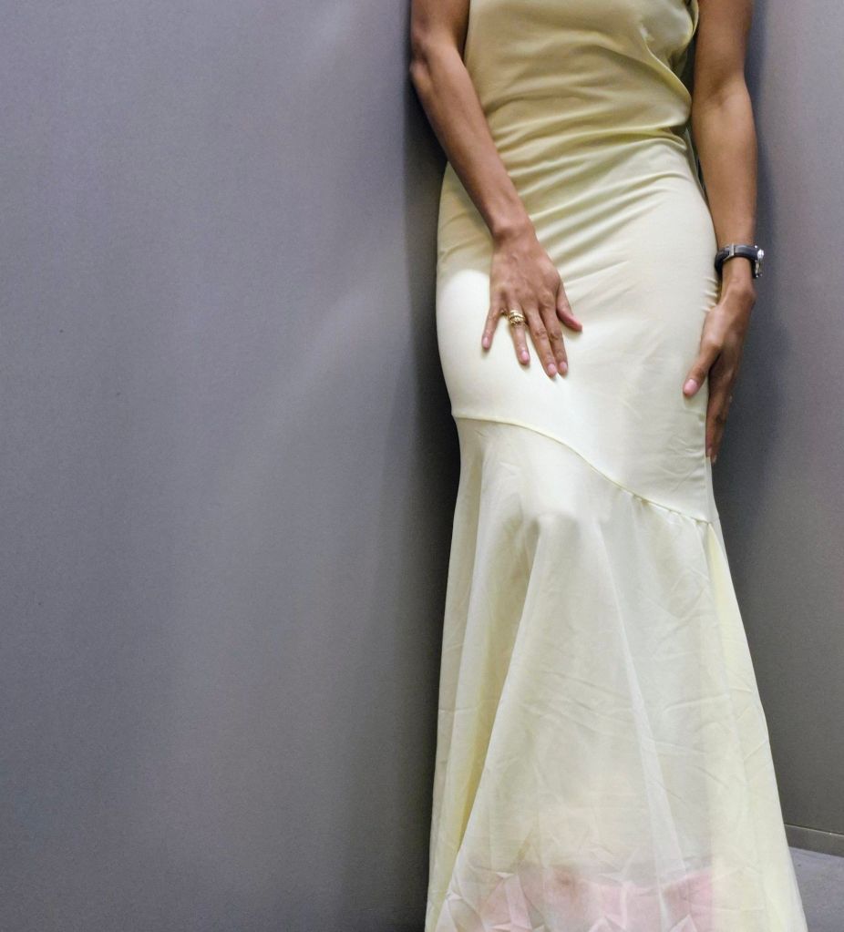 & in God’s goodness – he provided! I didn’t have to dig – just walked to the dress section and there it was in the larger than me sized area – it was staring at me when I walked up. I saw the yellow sheer material with joy and hope in my heart…grabbed the hanger and looked at the size.